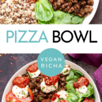 These Pizza Bowls are the ideal meal prep lunch for pizza lovers. Savory lentil sausage mix, fluffy quinoa, pan-roasted bell peppers and mushrooms, greens, fresh basil , chopped fresh tomatoes,and big old dollops of pizza sauce and homemade cashew mozzarella sauce. This is the lunch bowl of my dreams and if you like all things tomato and cheese, you will be all over it.