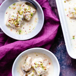 Bengali Rasmalai consists of small soft cheese curd/paneer balls or cakes immersed in saffron and cardamom-scented sweetened thickened milk. This Indian dessert is usually served with plenty of chopped pistachios and as you can imagine, it’s a pretty popular dessert for the holidays!