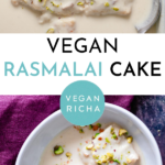 Vegan Rasmalai Cake is a dairy-free spin on the popular Bengali Dessert rasmalai that is typically served for Diwali! Moist almond and cashew flour cake squares immersed in a rich and creamy cashew pistachio “milk” scented with saffron and cardamom. It basically is Vegan Malai burfi soaked in Ras malai milk! Soyfree Glutenfree