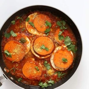 This Shakshuka comes together quickly and looks so pretty! Use a large skillet to accommodate as many sweet potato slices as possible.Â