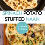 This recipe for Vegan Stuffed Spinach Potato & Cheese Naan Bread turns out perfect every time, without any added yeast thanks to a mix of dairy-free yogurt and baking powder. Served brushed with garlic butter – so good! Nutfree Soyfree. Gluten-free option included.