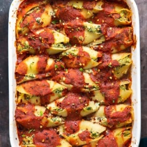 The filling comes together in a food processor in no time at all! Then all that’s left to do is to stuff the shells with that cheesy goodness and place them in a casserole dish along with some marinara sauce. You can use homemade or store-bought. Try my delicious homemade marinara from my instant pot book!