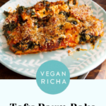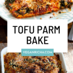 This Tofu Parmesan Bake layers pressed tofu with spinach, herbs, vegan cheese, and marinara sauce for the perfect comfort food Parmigiana dinner. Nutfree. Gluten-free option.