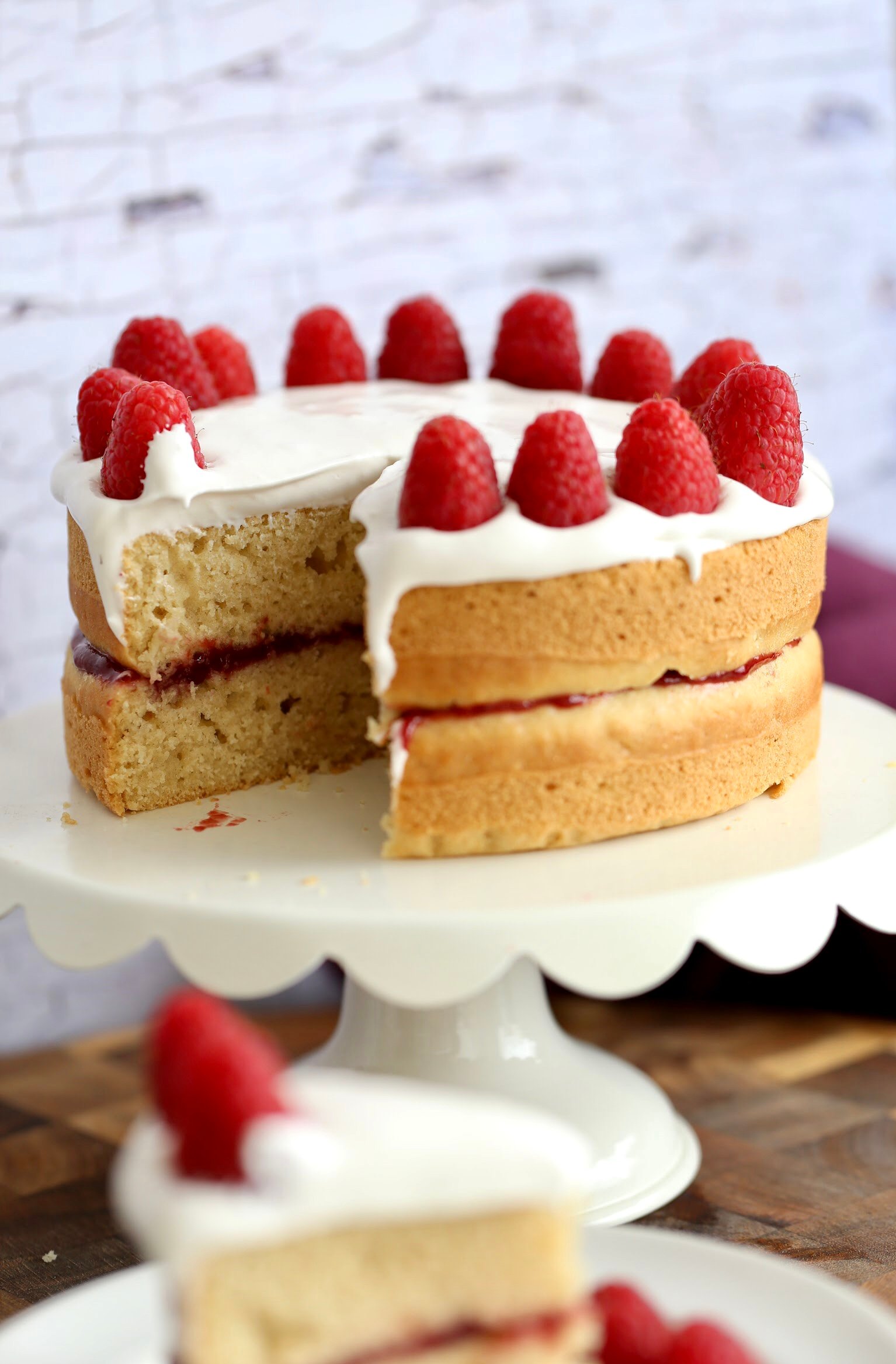 - for the filling, I went with raspberry preserves as it just looks so pretty against the white cake and makes for a fresh summery cake.