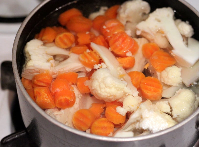 Blanch the chunky vegetables- cauliflower, carrot, green beans in it for 3-4 minutes.