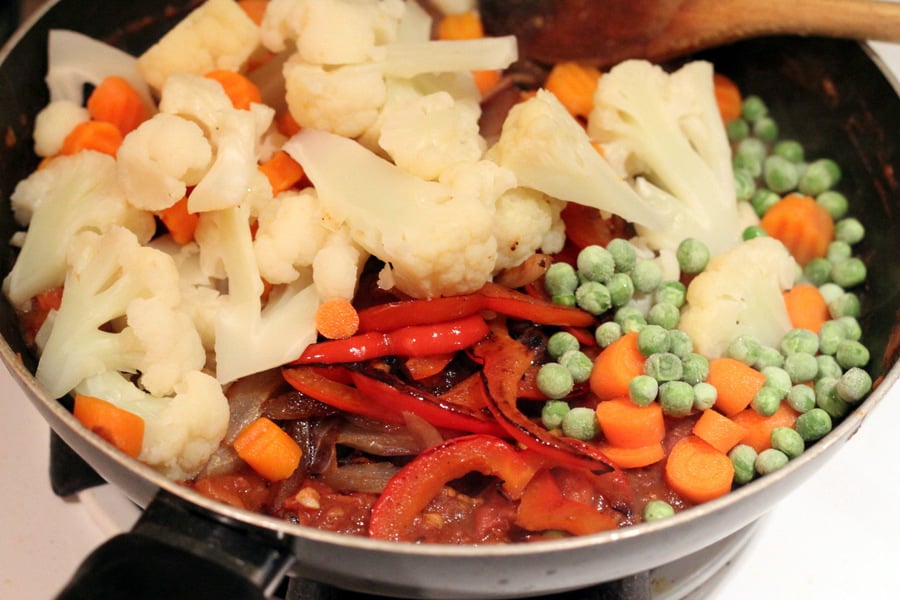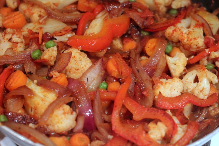 Lets celebrate with a Restaurant style Indian curry. This Jalfrezi is a spicy smoky vegetable preparation with crunchy veggies, tangy cumin spiced tomatoes. It is one of the simpler curries and should generally be vegan. A well prepared Jalfrezi should not have a creamy curry which you could end up with inย restaurantsย where they use the same gravy for pretty much all dishes:)