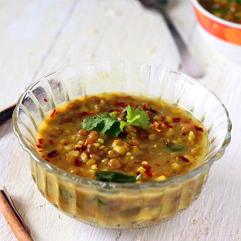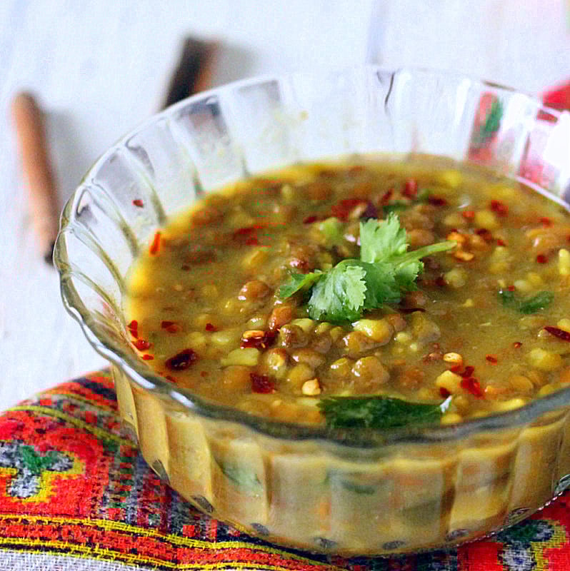 Jump to RecipeWhole Red lentil and Mung bean Daal stew with shallots and tomatoes.(Sabut Masoor aur Mung)