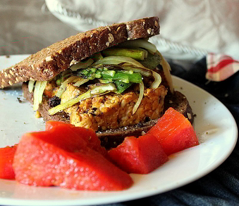 Tempeh cooked in spicy broth, then grilled a little and served with grilled veggies and grilled fruits.. try some grilled peaches in the sandwich.