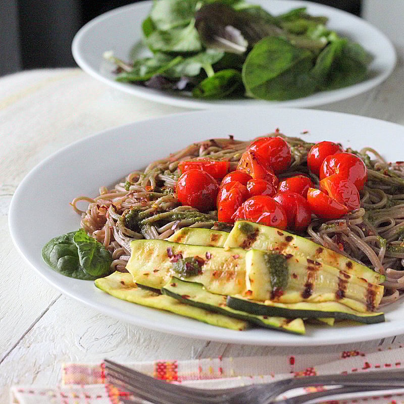 A simple light summer pasta meal.. Grilled zukes, pesto and cherry tomatoes.
