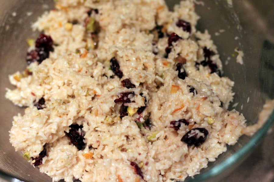 - (If the dough is very wet and squishy after chilling, add a bit more dry ingredients -coconut flakes and flour to make it into a slightly stiff but not dry dough)