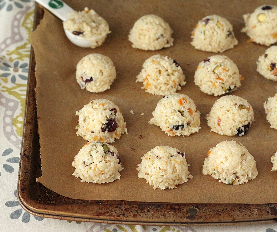 - Using a scoop or Tablespoon measure, scoop out the mixture. Scoop it out so it gets tightly packed. Or press with your fingers before placing on parchment.
